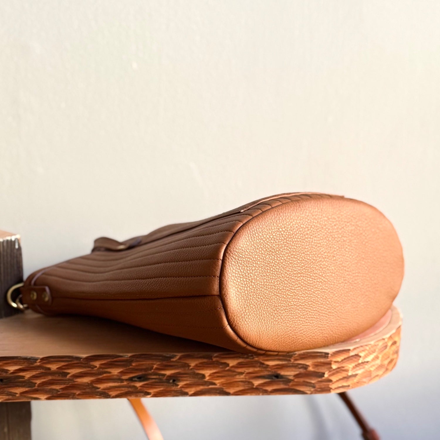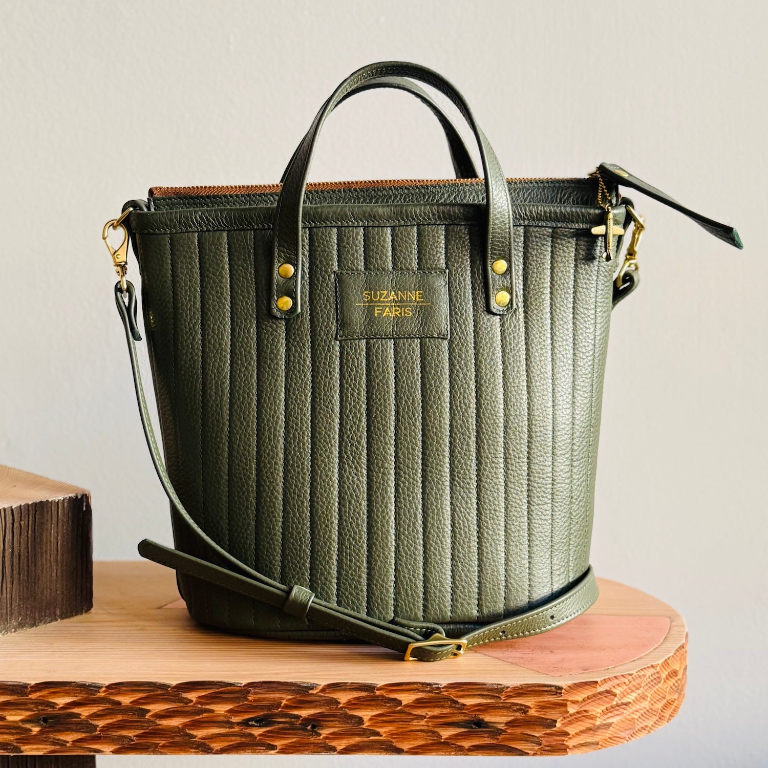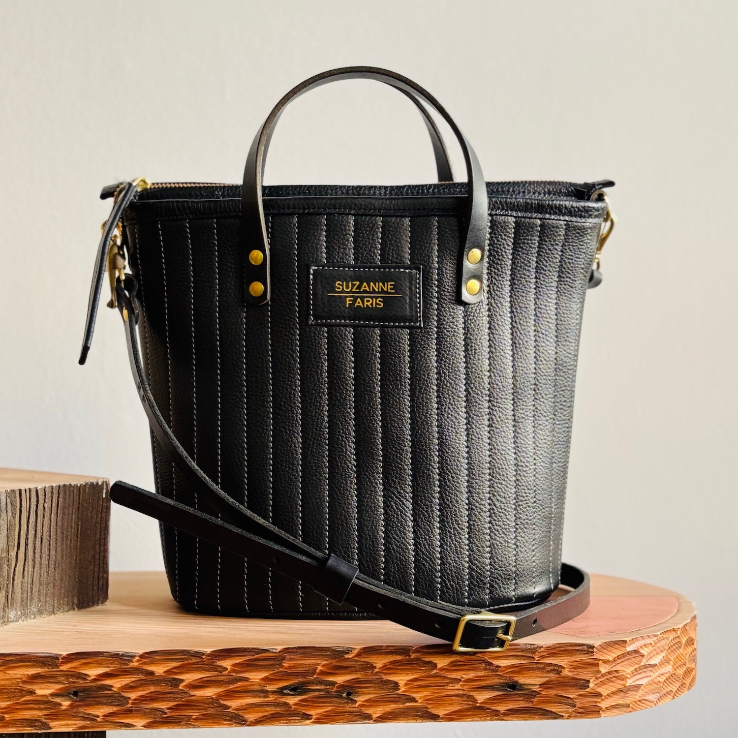 The large statement bag from the new Aviatrix Collection celebrating the courage of female pilots in WWII. In deep Ebony, enjoy it's ease of use with a secure zippered top and convenient handles. Or wear it crossbody with the optional crossbody strap. Inside you'll find a quilted canvas interior with two side pockets for organizing your essentials. With the oval bottom you can set it anywhere, the sturdy vertical aviation stitching on the sides keep it standing strong.