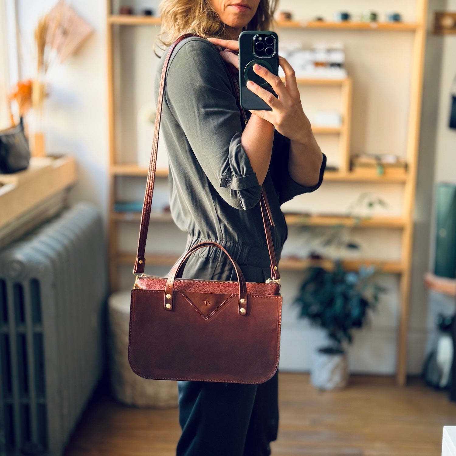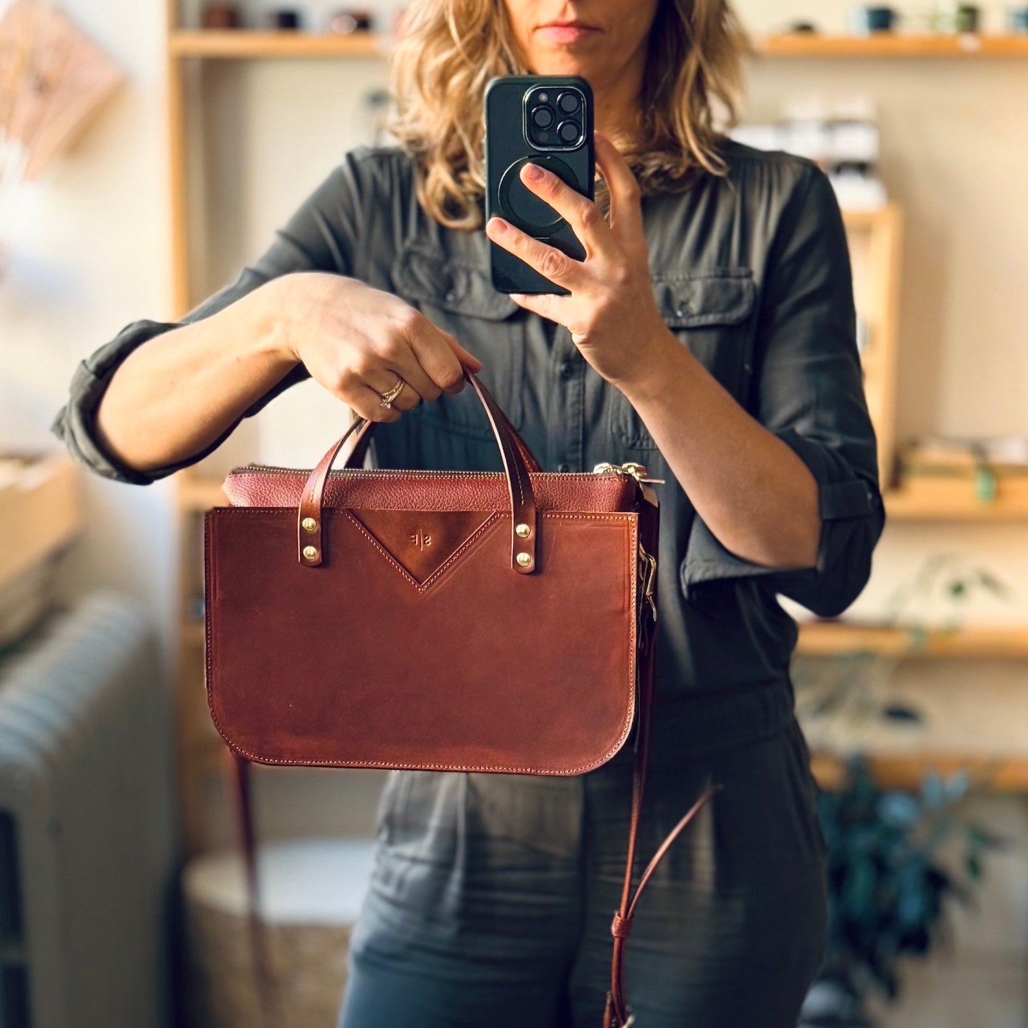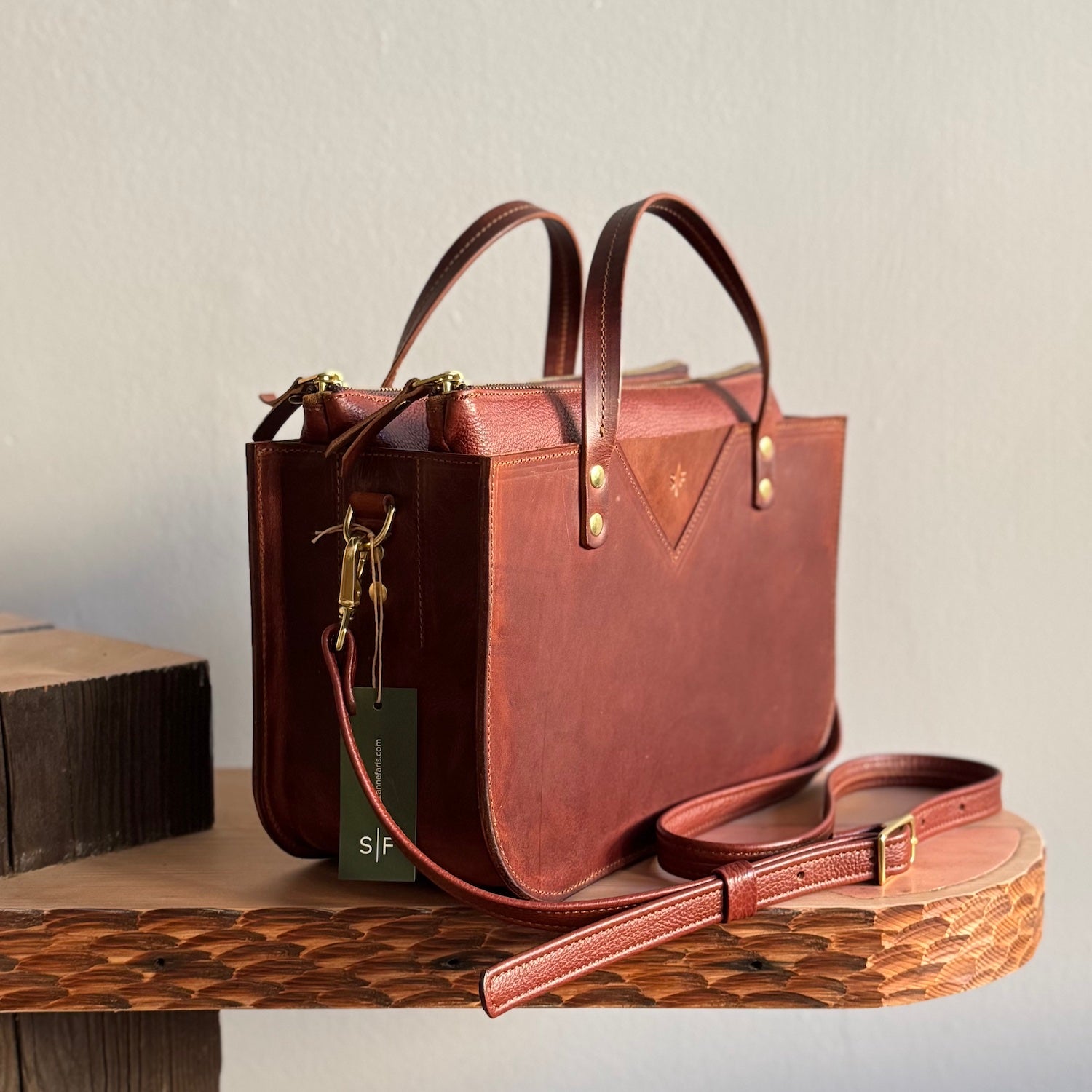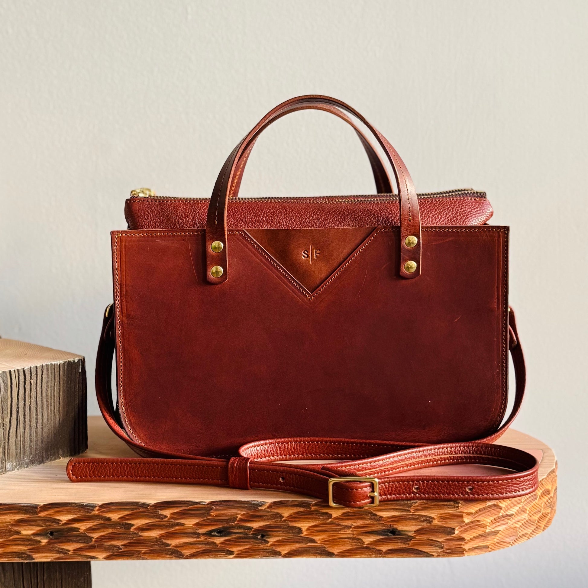 A truly unique handbag style with multiple sections, compartments and possibilities. A treasure to behold! With a few unexpected pockets hidden away. Genuine vegtan leather in the new dark leather options, with solid brass hardware and optional crossbody strap.