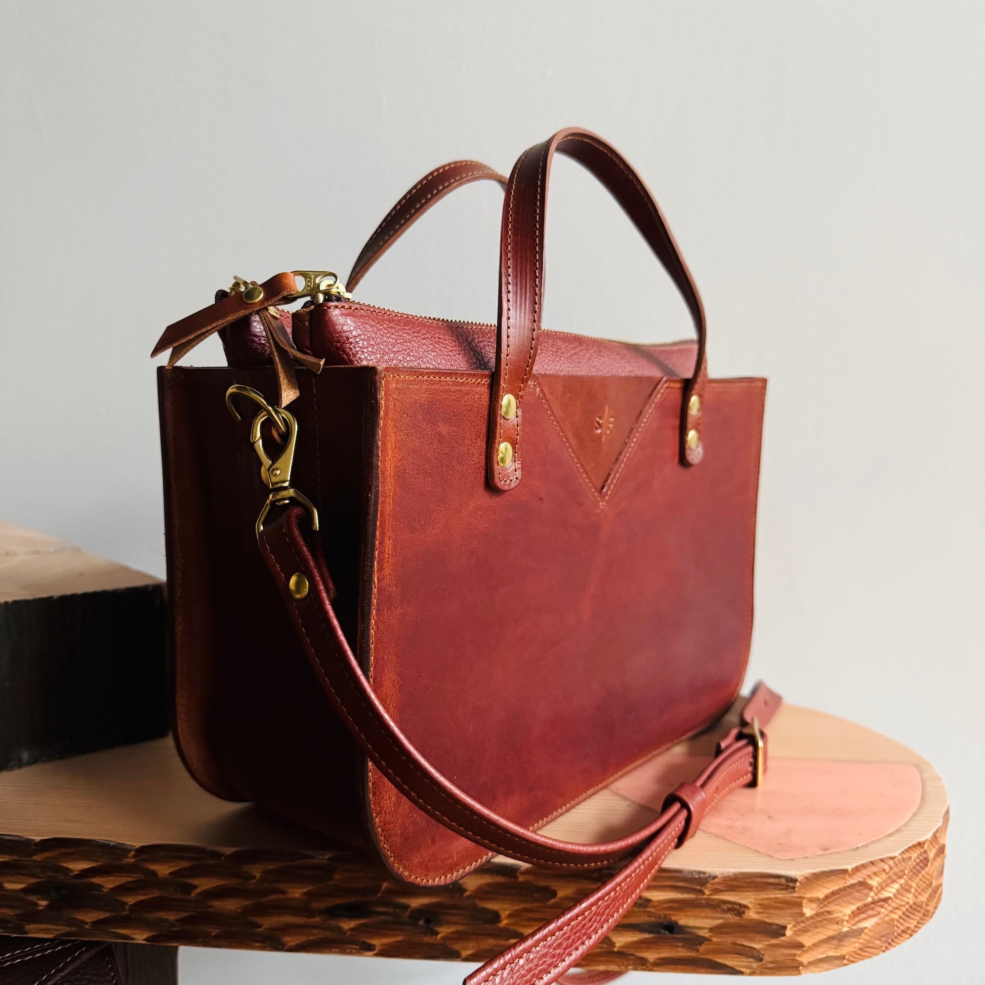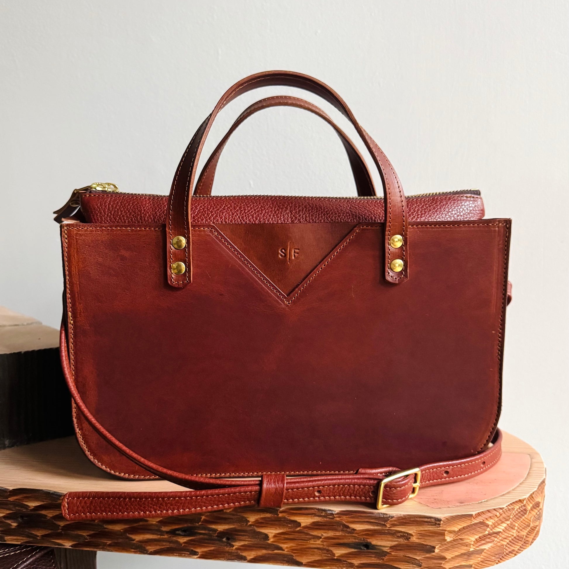 A truly unique handbag style with multiple sections, compartments and possibilities. A treasure to behold! With a few unexpected pockets hidden away. Genuine vegtan leather in the new dark leather options, with solid brass hardware and optional crossbody strap.