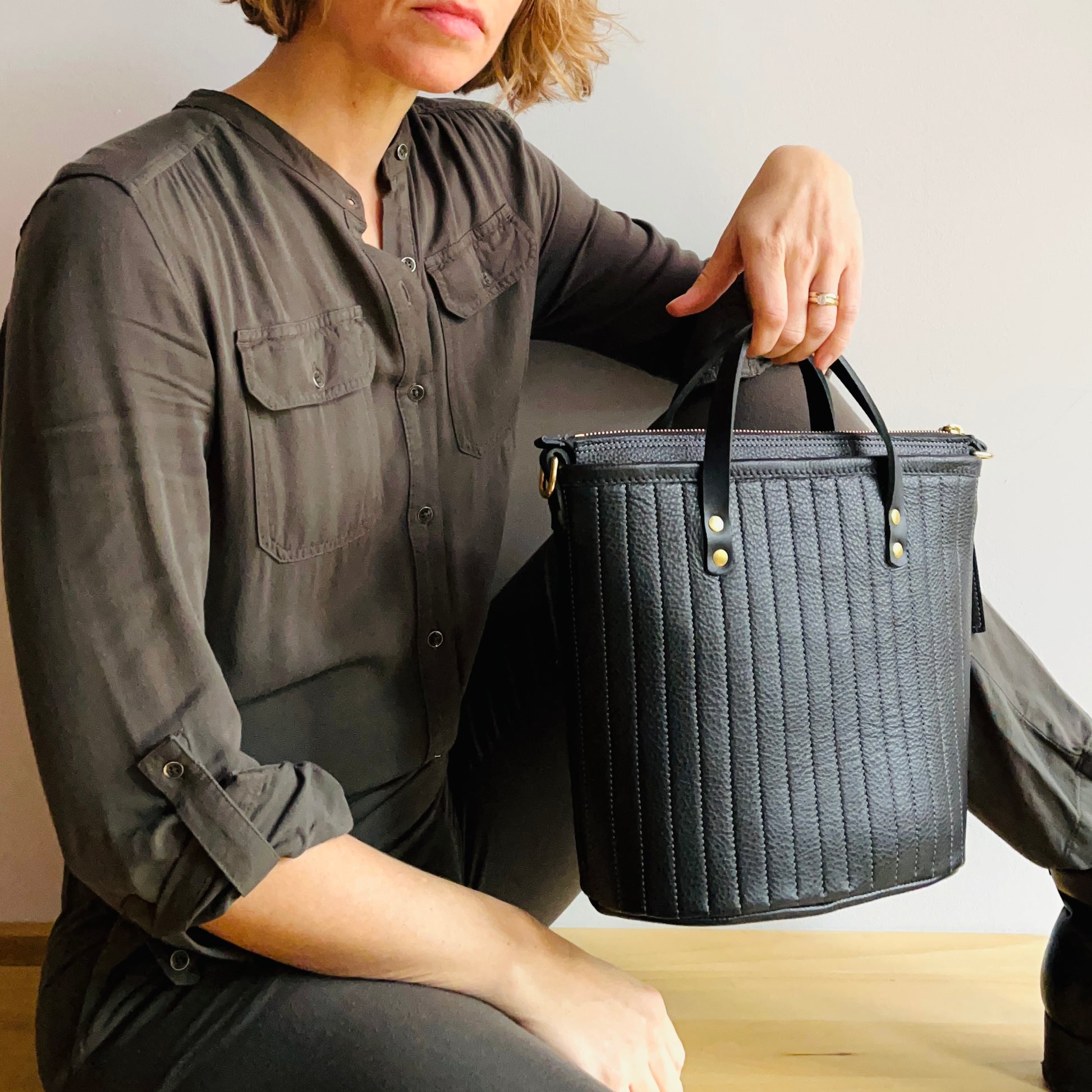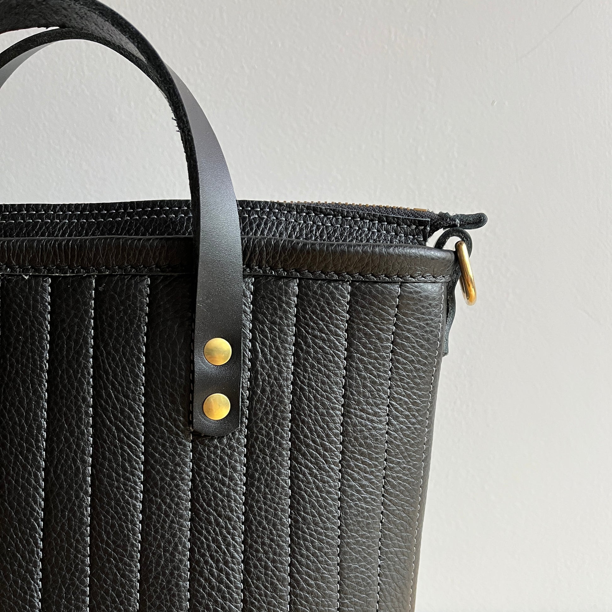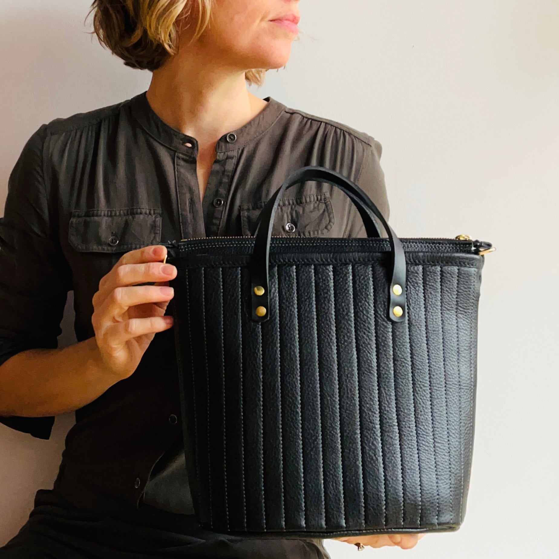 The large statement bag from the new Aviatrix Collection celebrating the courage of female pilots in WWII. In deep Ebony, enjoy it's ease of use with a secure zippered top and convenient handles. Or wear it crossbody with the optional crossbody strap. Inside you'll find a quilted canvas interior with two side pockets for organizing your essentials. With the oval bottom you can set it anywhere, the sturdy vertical aviation stitching on the sides keep it standing strong.