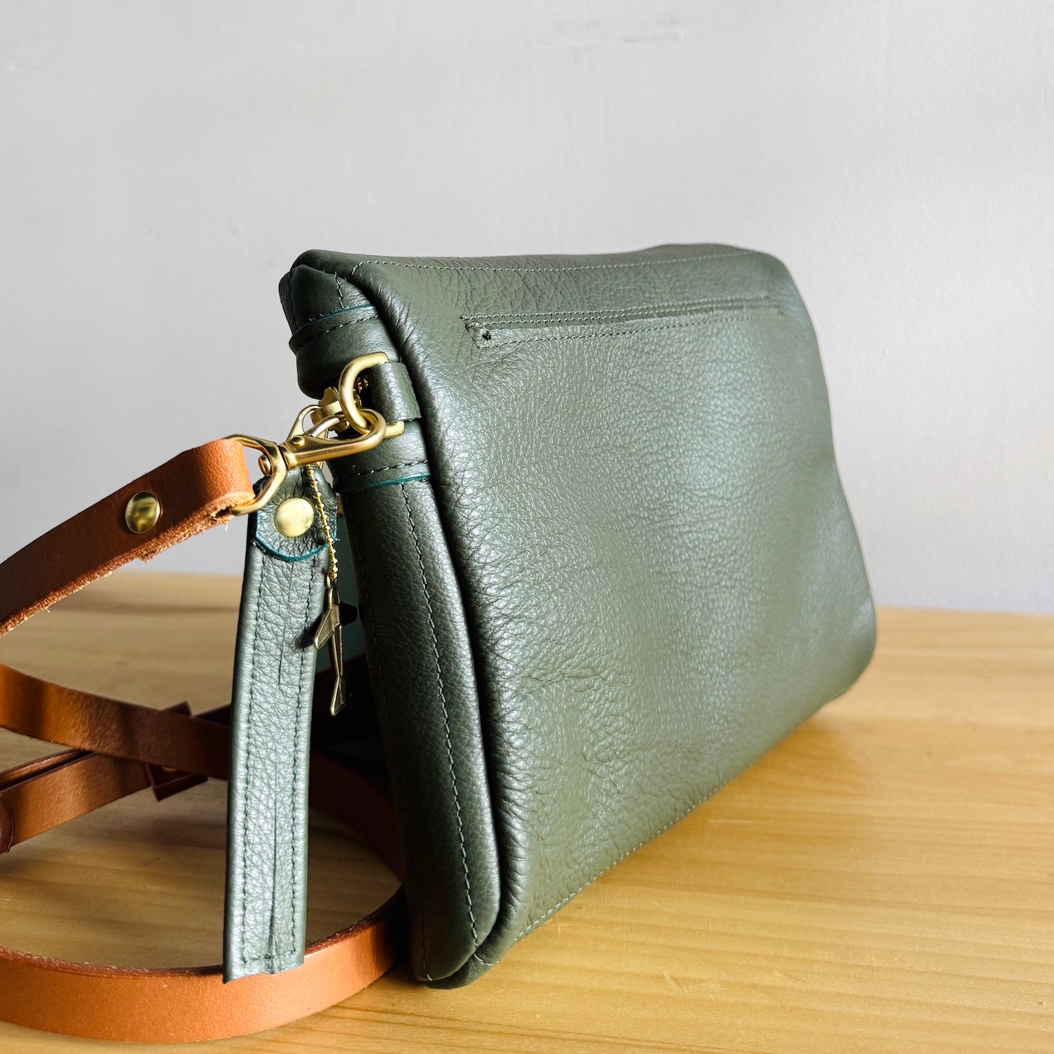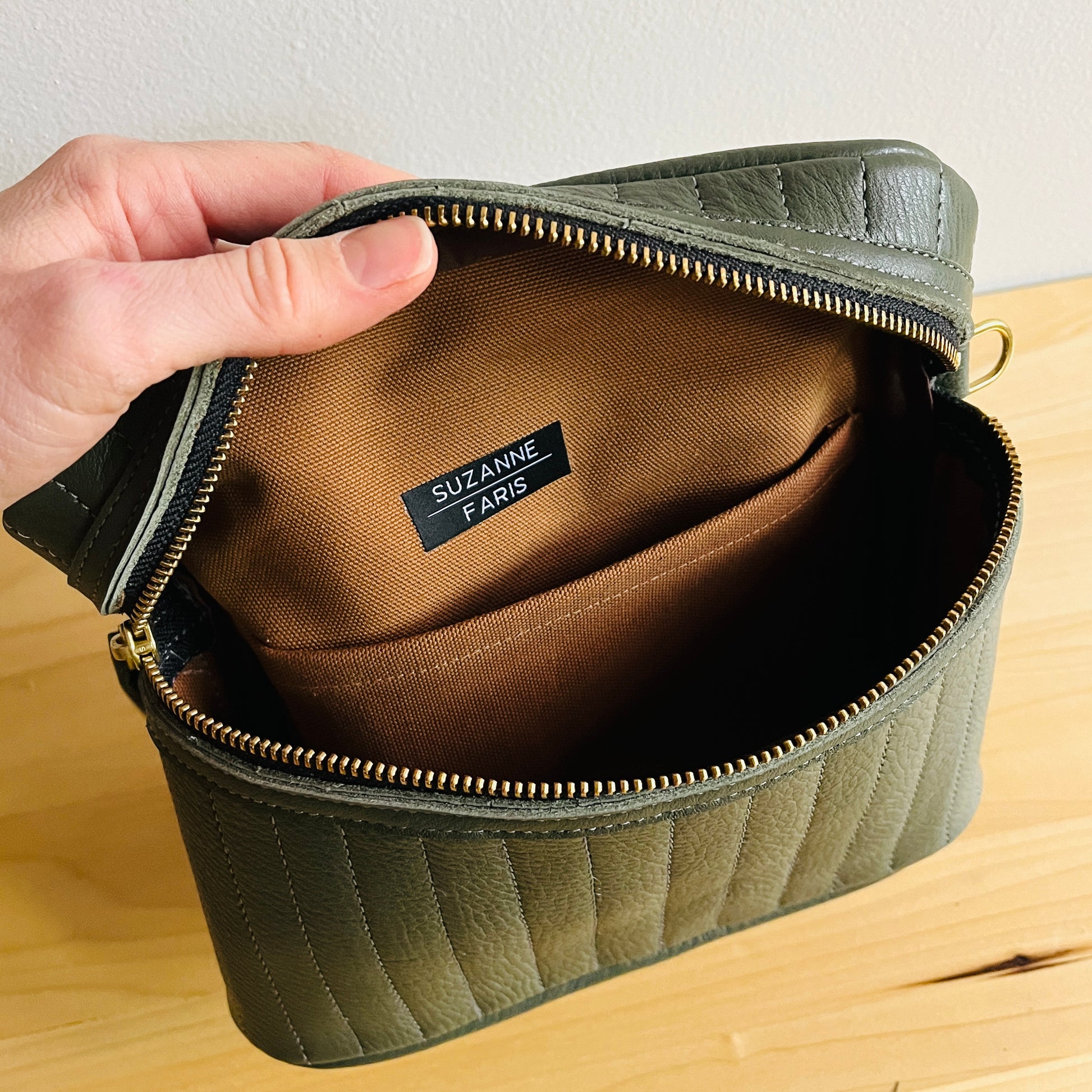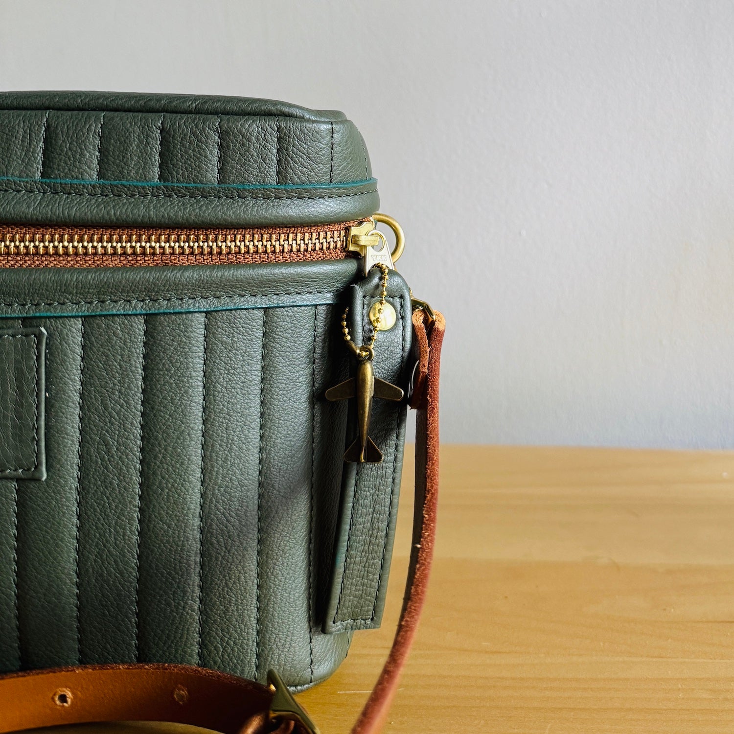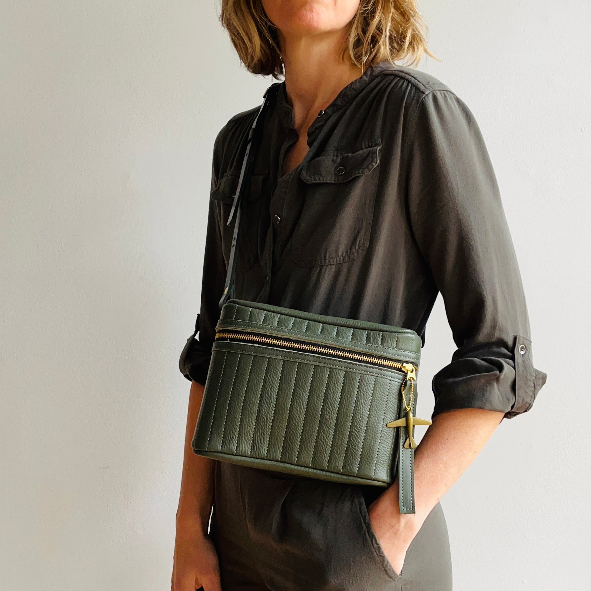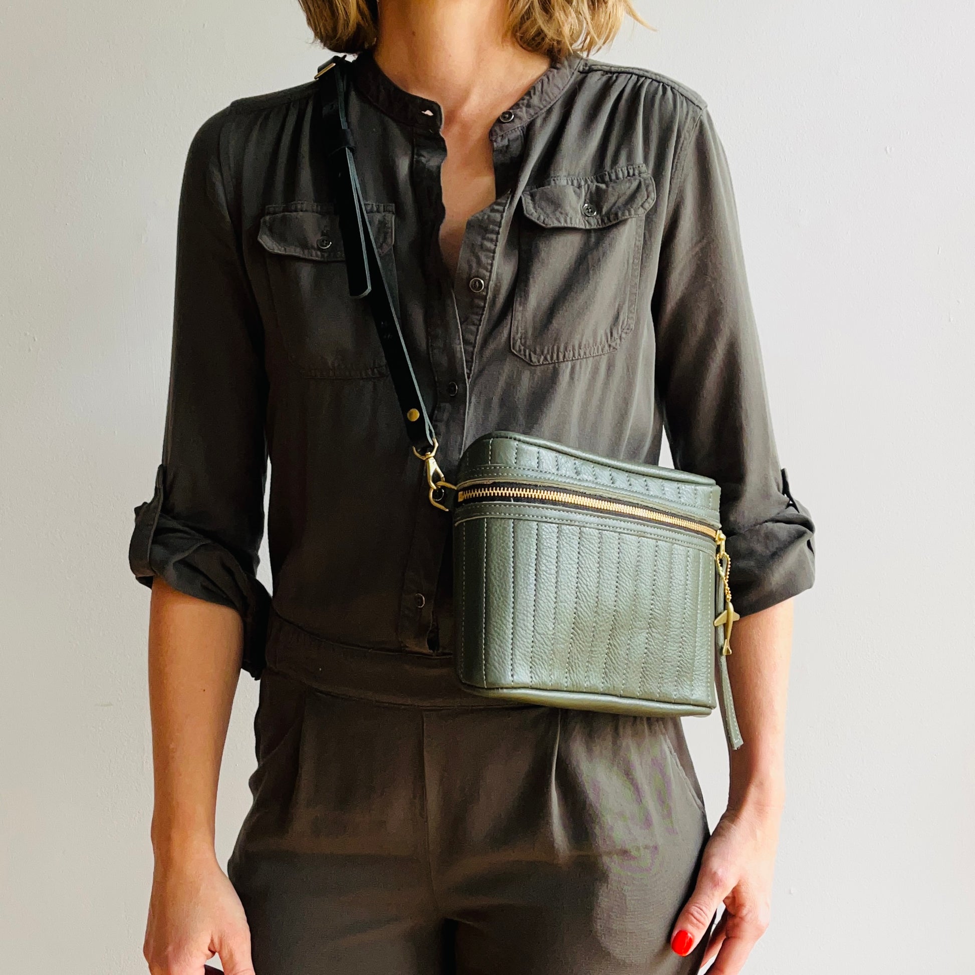 The little sister in the new "Aviatrix" collection. Dark olive offers a subtle alternative to traditional black or brown. The most comfortable chest bag you'll ever find! "The Trix" is your go-to bag for a busy around town day when you're in and out. It stays in place whether you're driving or lugging things around, keeping your essentials close. The firm stitched front mimics the vertical stitching on vintage airplane seats and provides some structure while the soft back conforms comfortably to your body.