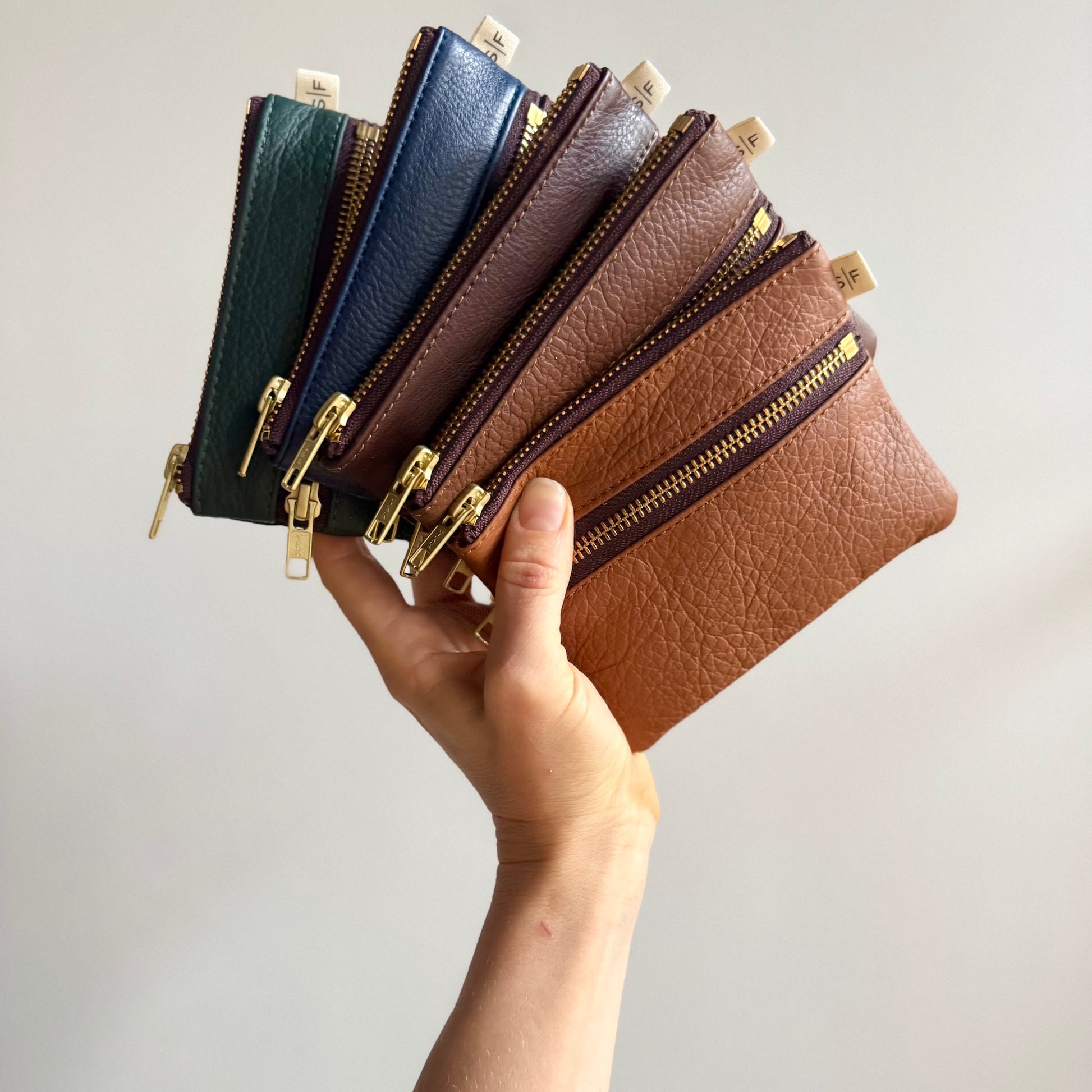 Time to tuck the little things in. Select your favourite colour and be on your way! Enjoy these two-zips as a simple wallet, to organize change, or for your favourite compact/lipstick combo.